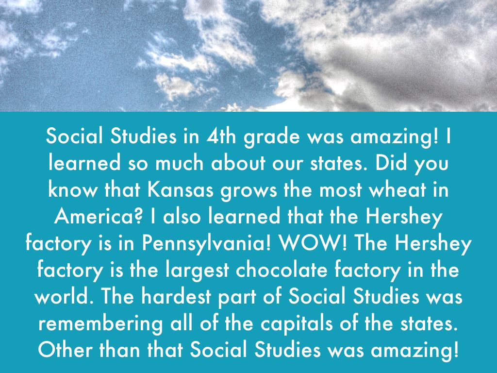 Social Studies in 4th grade was amazing! I learned so much about our states. Did you know that Kansas grows the most wheat in America? I also learned that the Hershey factory is in Pennsylvania! WOW! The Hershey factory is the largest chocolate factory in the world. The hardest part of Social Studies was remembering all of the capitals of the states. Other than that Social Studies was amazing!