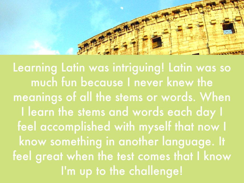 Learning Latin was intriguing! Latin was so much fun because I never knew the meanings of all the stems or words. When I learn the stems and words each day I feel accomplished with myself that now I know something in another language. It feel great when the test comes that I know I'm up to the challenge!