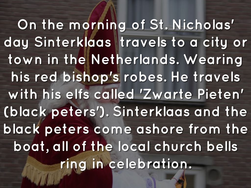 On the morning of St. Nicholas' day Sinterklaas travels to a city or town in the Netherlands. Wearing his red bishop's robes. He travels with his elfs called 'Zwarte Pieten' (black peters'). Sinterklaas and the black peters come ashore from the boat, all of the local church bells ring in celebration.