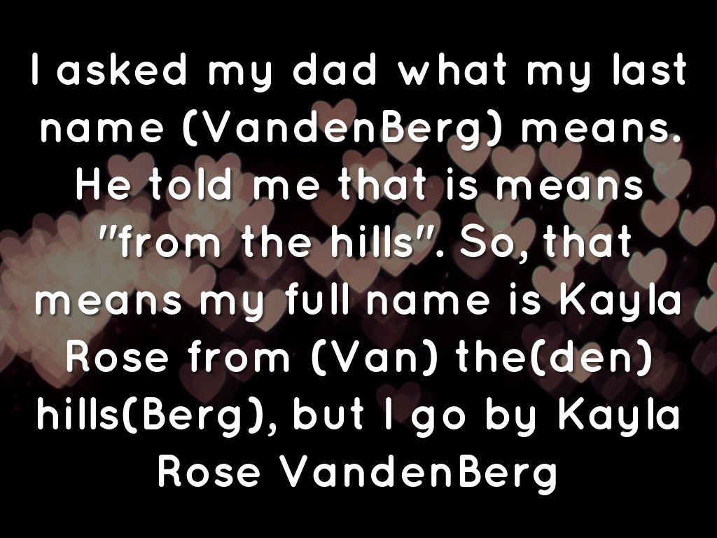 I asked my dad what my last name (VandenBerg) means. He told me that is means "from the hills". So, that means my full name is Kayla Rose from (Van) the(den) hills(Berg), but I go by Kayla Rose VandenBerg