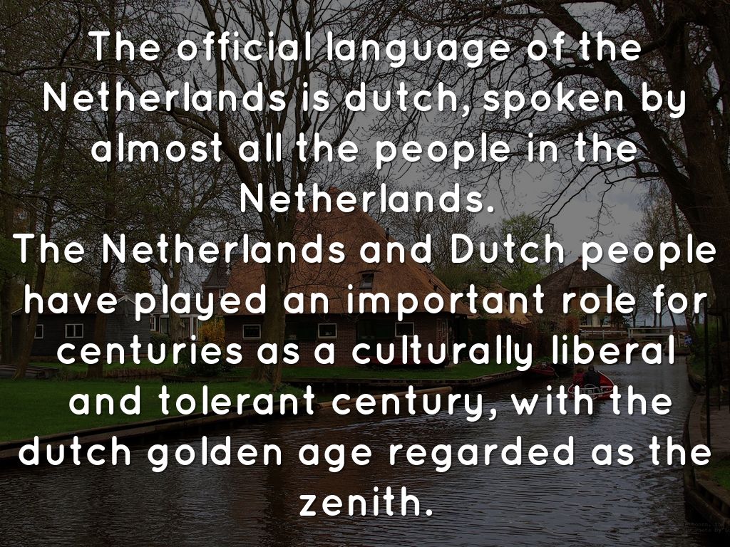 The official language of the Netherlands is dutch, spoken by almost all the people in the Netherlands.
