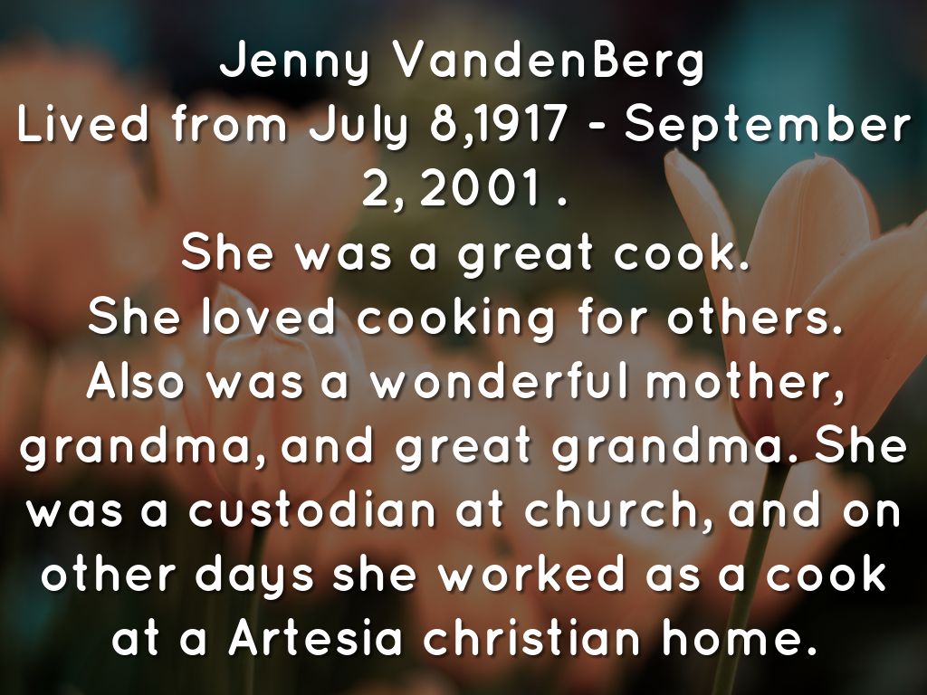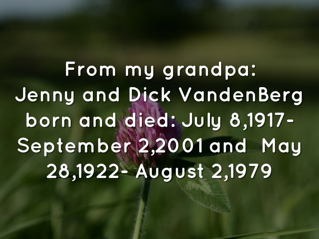 Jenny and Dick VandenBerg born and died: July 8,1917-September 2,2001 and May 28,1922- August 2,1979