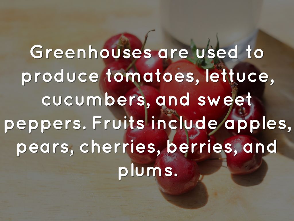 Greenhouses are used to produce tomatoes, lettuce, cucumbers, and sweet peppers. Fruits include apples, pears, cherries, berries, and plums.