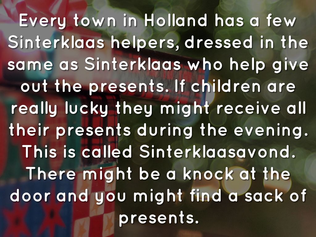 Every town in Holland has a few Sinterklaas helpers, dressed in the same as Sinterklaas who help give out the presents. If children are really lucky they might receive all their presents during the evening. This is called Sinterklaasavond. There might be a knock at the door and you might find a sack of presents.