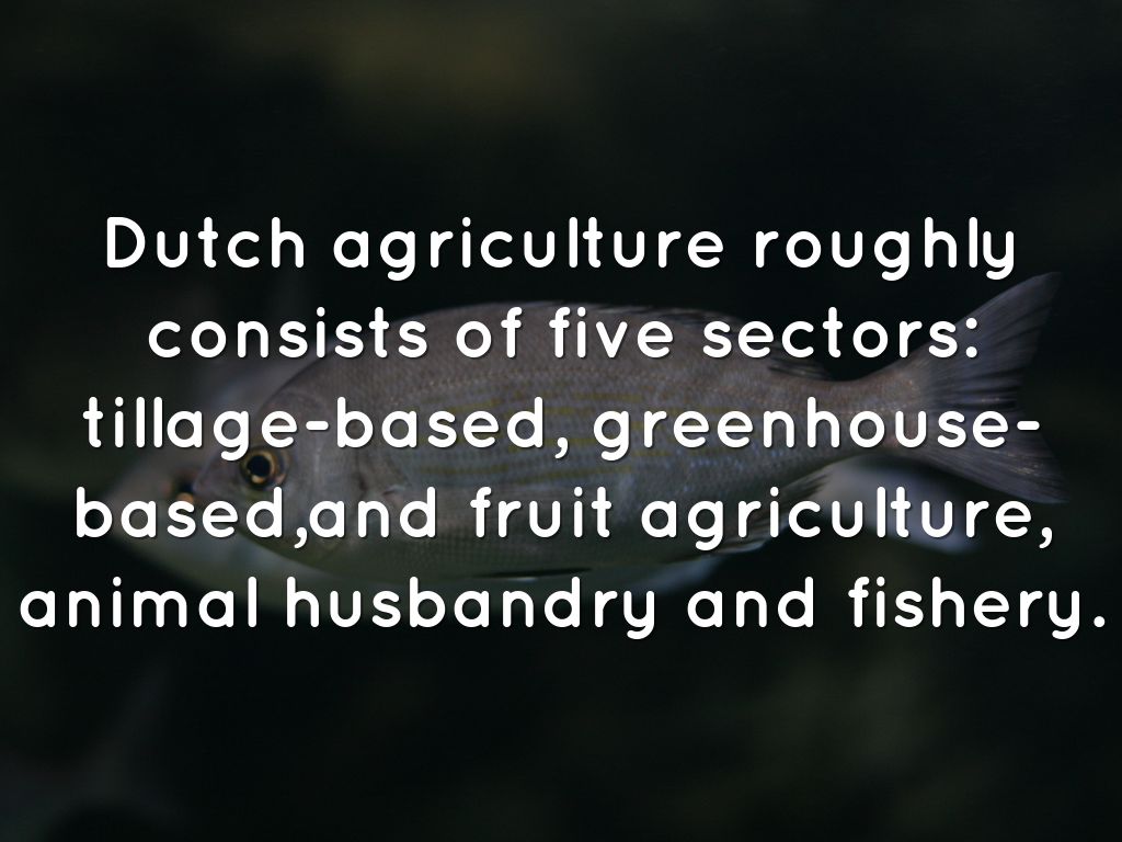 Dutch agriculture roughly consists of five sectors: tillage-based, greenhouse-based,and fruit agriculture, animal husbandry and fishery.