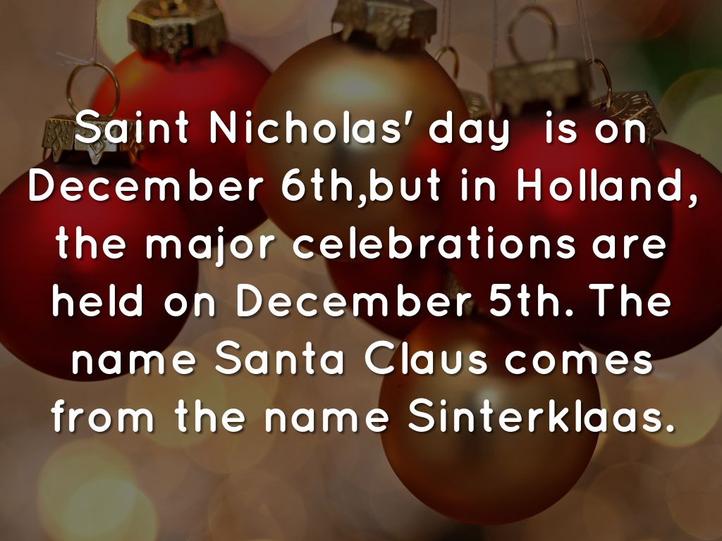 Saint Nicholas' day is on December 6th,but in Holland, the major celebrations are held on December 5th. The name Santa Claus comes from the name Sinterklaas.