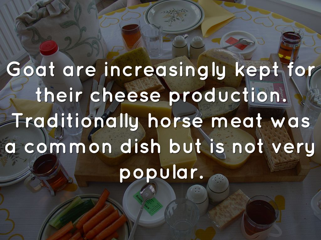 Goat are increasingly kept for their cheese production. Traditionally horse meat was a common dish but is not very popular.