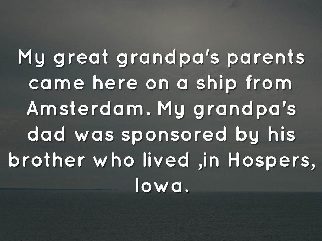 My great grandpa's parents came here on a ship from Amsterdam. My grandpa's dad was sponsored by his brother who lived ,in Hospers, Iowa.