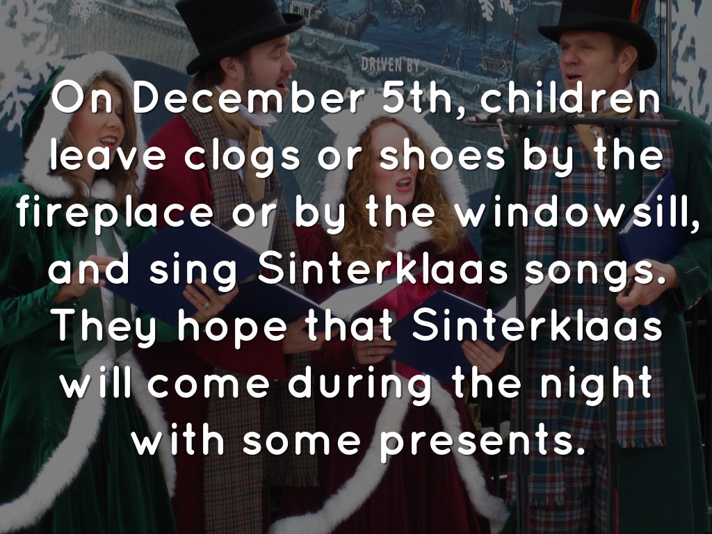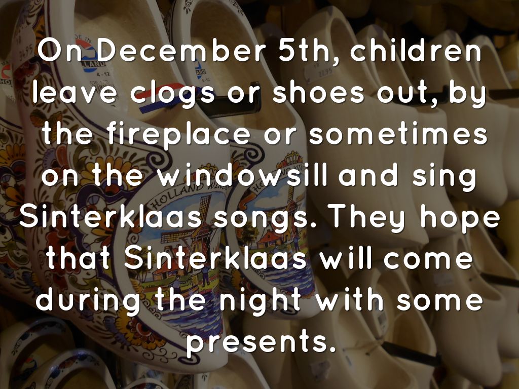 On December 5th, children leave clogs or shoes by the fireplace or by the windowsill, and sing Sinterklaas songs. They hope that Sinterklaas will come during the night with some presents.
