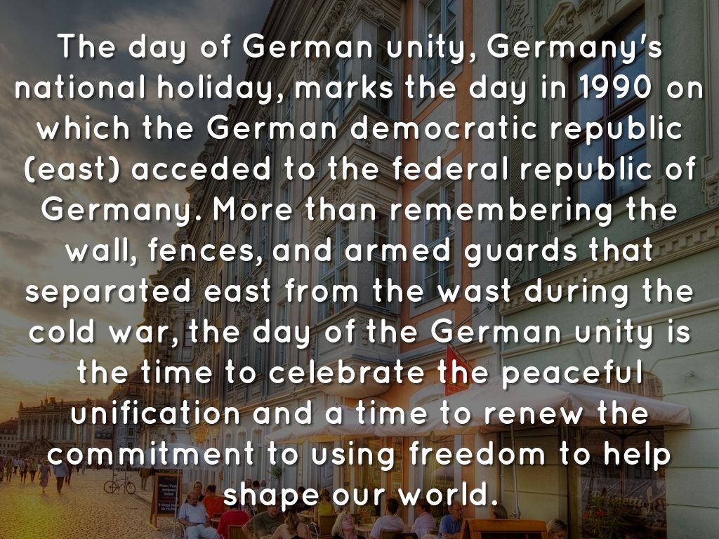 The day of German unity, Germany's national holiday, marks the day in 1990 on which the German democratic republic (east) acceded to the federal republic of Germany. More than remembering the wall, fences, and armed guards that separated east from the wast during the cold war, the day of the German unity is the time to celebrate the peaceful unification and a time to renew the commitment to using freedom to help shape our world.