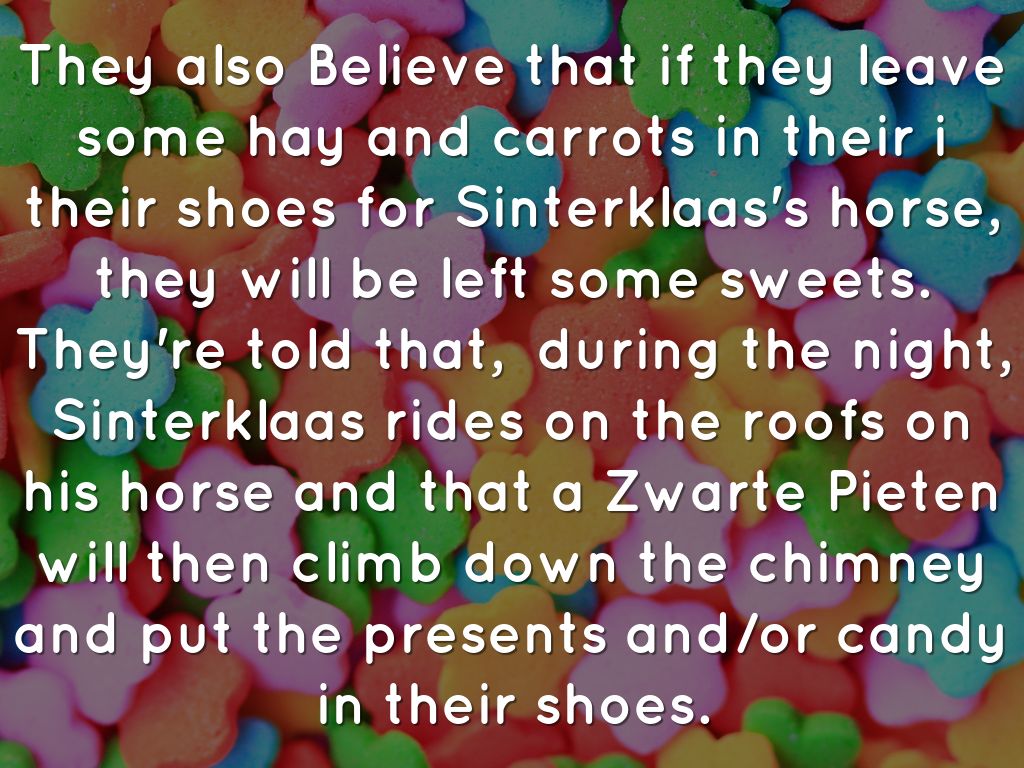 They also Believe that if they leave some hay and carrots in their i their shoes for Sinterklaas's horse, they will be left some sweets. They're told that, during the night, Sinterklaas rides on the roofs on his horse and that a Zwarte Pieten will then climb down the chimney and put the presents and/or candy in their shoes.