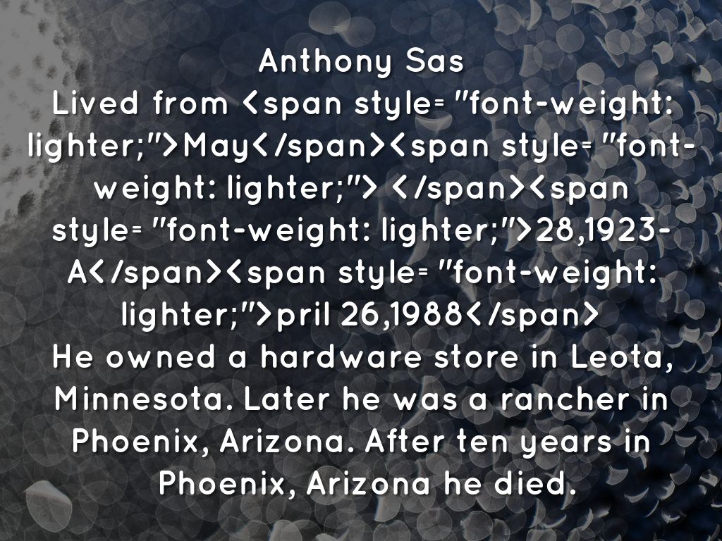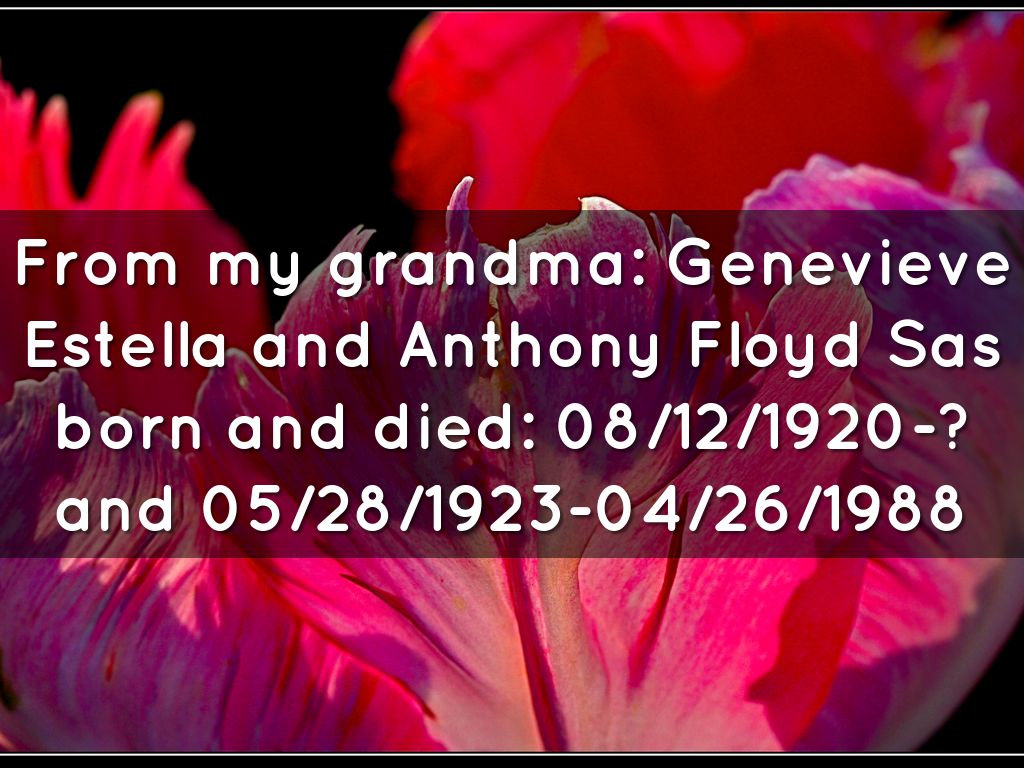 From my grandma: Genevieve Estella and Anthony Floyd Sas born and died: 08/12/1920-? and 05/28/1923-04/26/1988
