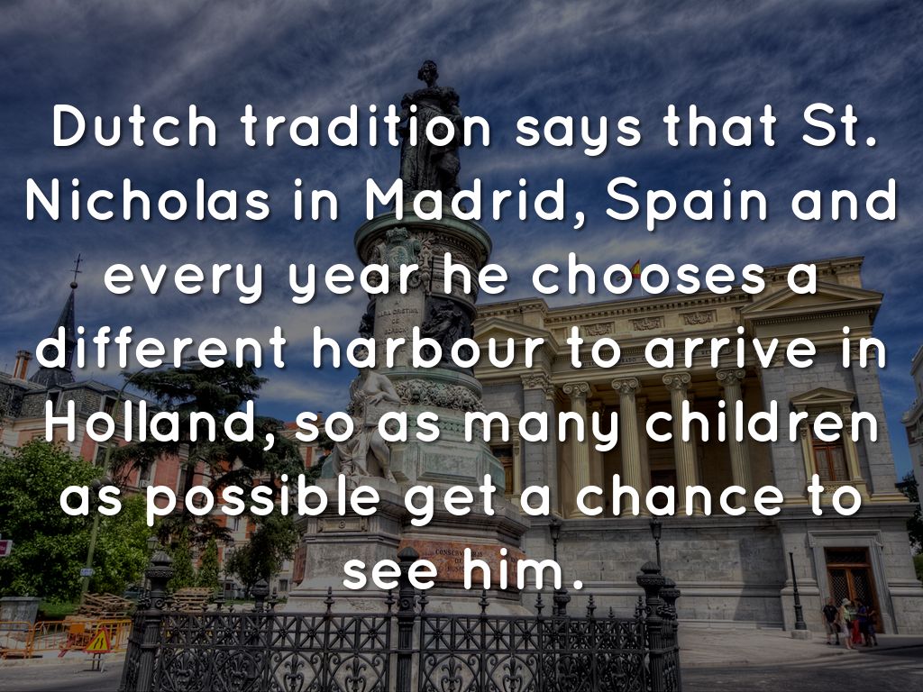 Dutch tradition says that St. Nicholas in Madrid, Spain and every year he chooses a different harbour to arrive in Holland, so as many children as possible get a chance to see him.