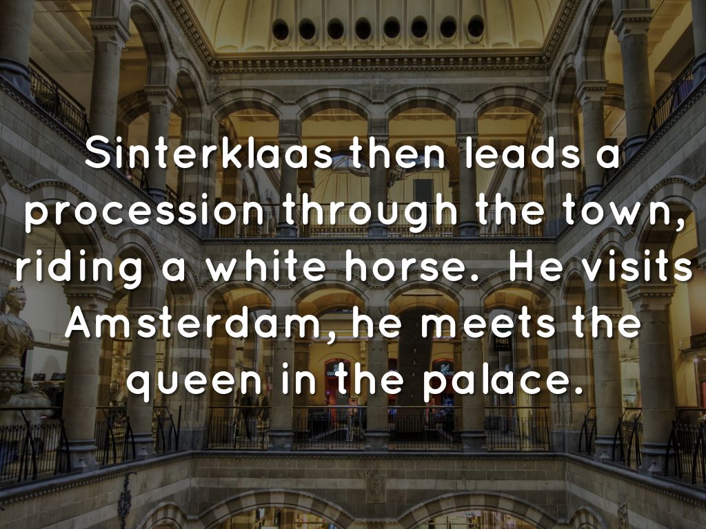 Sinterklaas then leads a procession through the town, riding a white horse. He visits Amsterdam, he meets the queen in the palace.