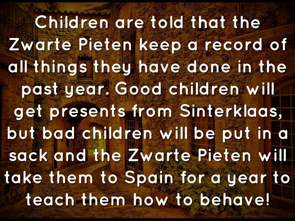 Children are told that the Zwarte Pieten keep a record of all things they have done in the past year. Good children will get presents from Sinterklaas, but bad children will be put in a sack and the Zwarte Pieten will take them to Spain for a year to teach them how to behave!