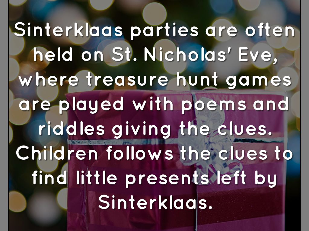 Sinterklaas parties are often held on St. Nicholas' Eve, where treasure hunt games are played with poems and riddles giving the clues. Children follows the clues to find little presents left by Sinterklaas.