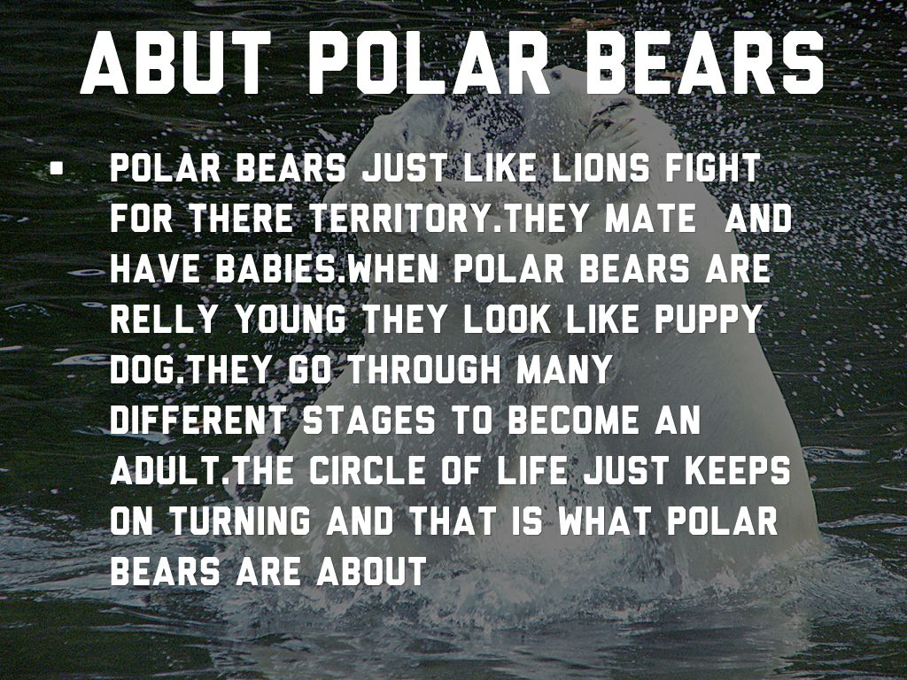 polar bears just like lions fight for there territory.they mate and have babies.when polar bears are relly young they look like puppy dog.they go through many different stages to become an adult.the circle of life just keeps on turning and that is what polar bears are about