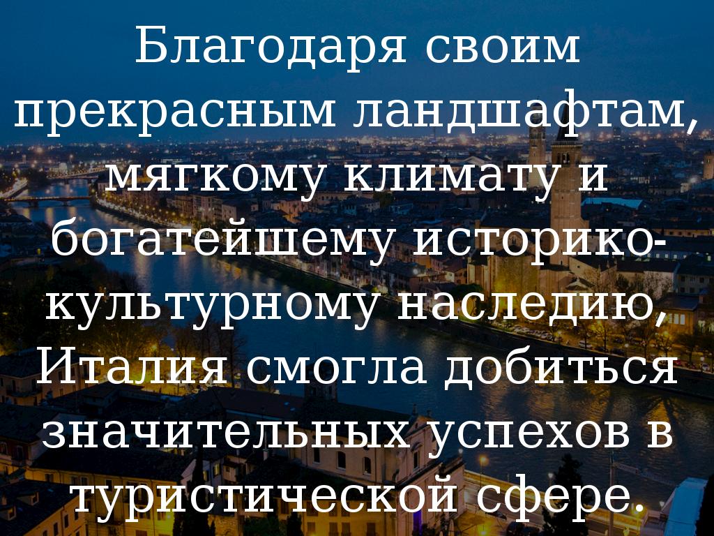 Благодаря своим прекрасным ландшафтам, мягкому климату и богатейшему историко-культурному наследию, Италия смогла добиться значительных успехов в туристической сфере.