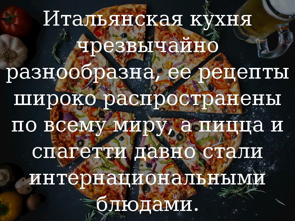 Итальянская кухня чрезвычайно разнообразна, ее рецепты широко распространены по всему миру, а пицца и спагетти давно стали интернациональными блюдами.