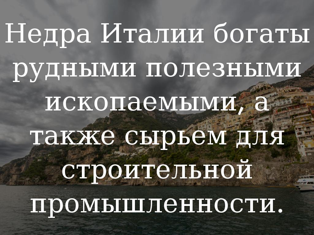 Недра Италии богаты рудными полезными ископаемыми, а также сырьем для строительной промышленности.