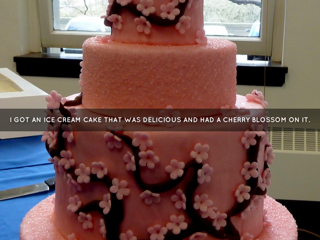 I GOT AN ICE CREAM CAKE THAT WAS DELICIOUS AND HAD A CHERRY BLOSSOM ON IT.
