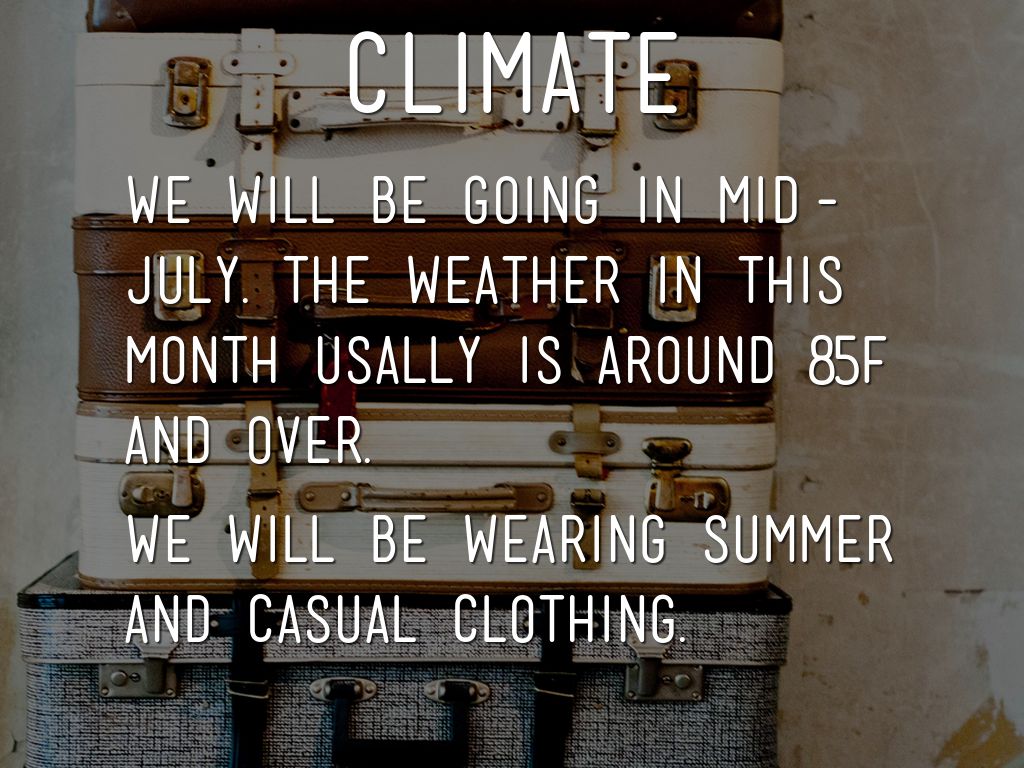 We will be going in mid-July. The weather in this month usally is around 85F and over.