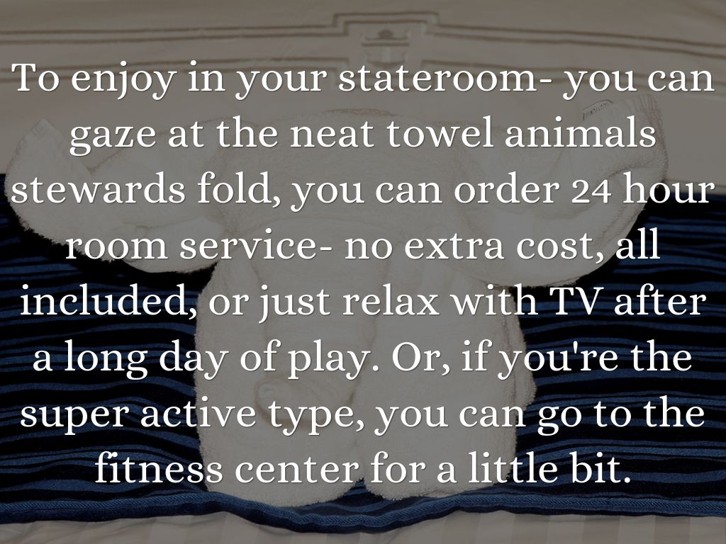 To enjoy in your stateroom- you can gaze at the neat towel animals stewards fold, you can order 24 hour room service- no extra cost, all included, or just relax with TV after a long day of play. Or, if you're the super active type, you can go to the fitness center for a little bit.