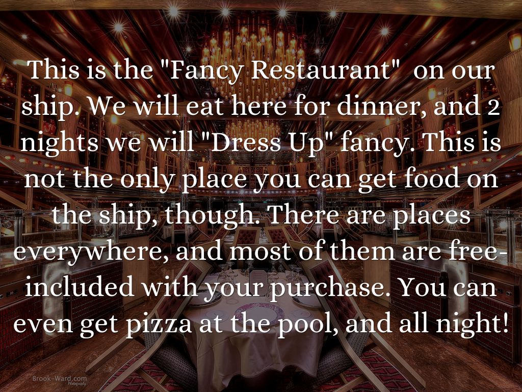 This is the "Fancy Restaurant" on our ship. We will eat here for dinner, and 2 nights we will "Dress Up" fancy. This is not the only place you can get food on the ship, though. There are places everywhere, and most of them are free-included with your purchase. You can even get pizza at the pool, and all night!