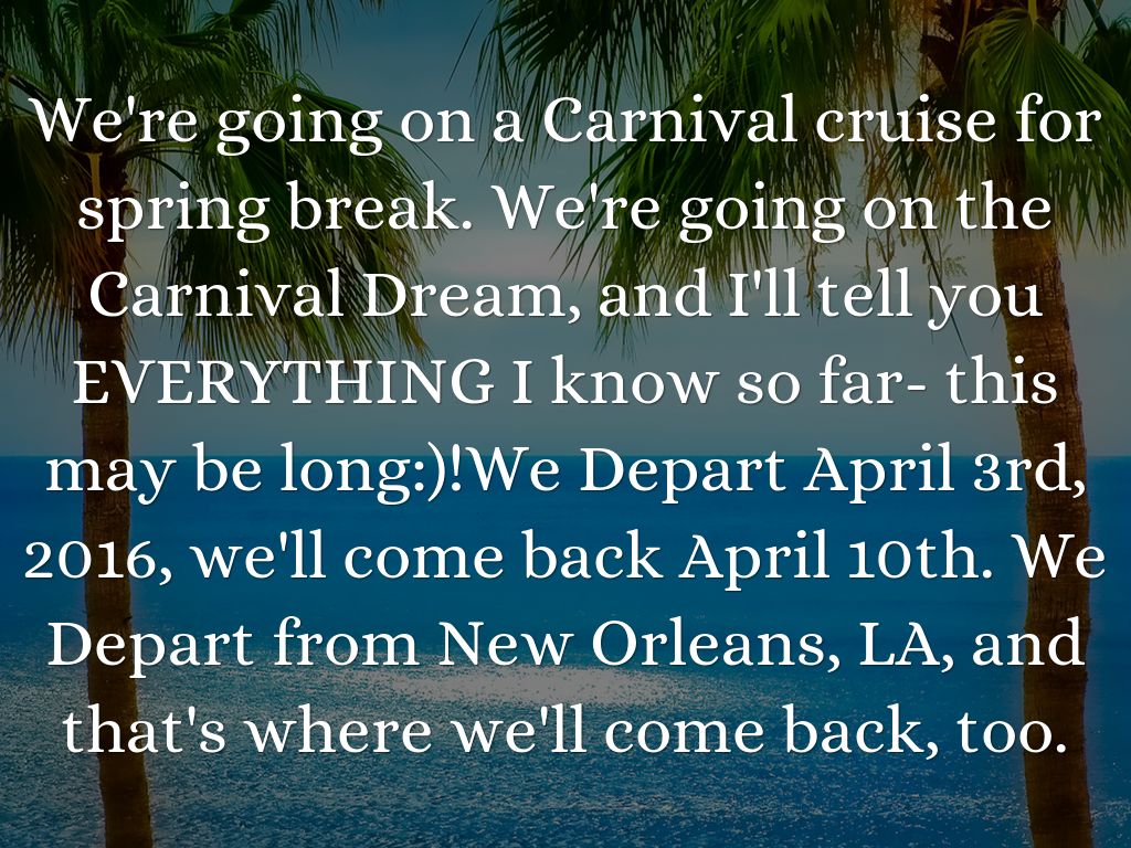 We're going on a Carnival cruise for spring break. We're going on the Carnival Dream, and I'll tell you EVERYTHING I know so far- this may be long:)!We Depart April 3rd, 2016, we'll come back April 10th. We Depart from New Orleans, LA, and that's where we'll come back, too.