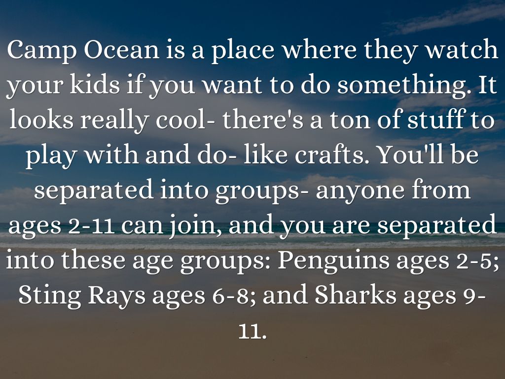 Camp Ocean is a place where they watch your kids if you want to do something. It looks really cool- there's a ton of stuff to play with and do- like crafts. You'll be separated into groups- anyone from ages 2-11 can join, and you are separated into these age groups: Penguins ages 2-5; Sting Rays ages 6-8; and Sharks ages 9-11.