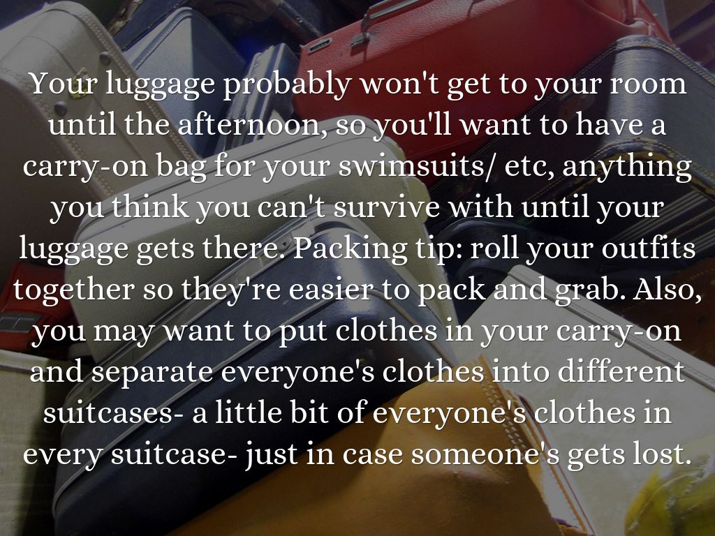 Your luggage probably won't get to your room until the afternoon, so you'll want to have a carry-on bag for your swimsuits/ etc, anything you think you can't survive with until your luggage gets there. Packing tip: roll your outfits together so they're easier to pack and grab. Also, you may want to put clothes in your carry-on and separate everyone's clothes into different suitcases- a little bit of everyone's clothes in every suitcase- just in case someone's gets lost.
