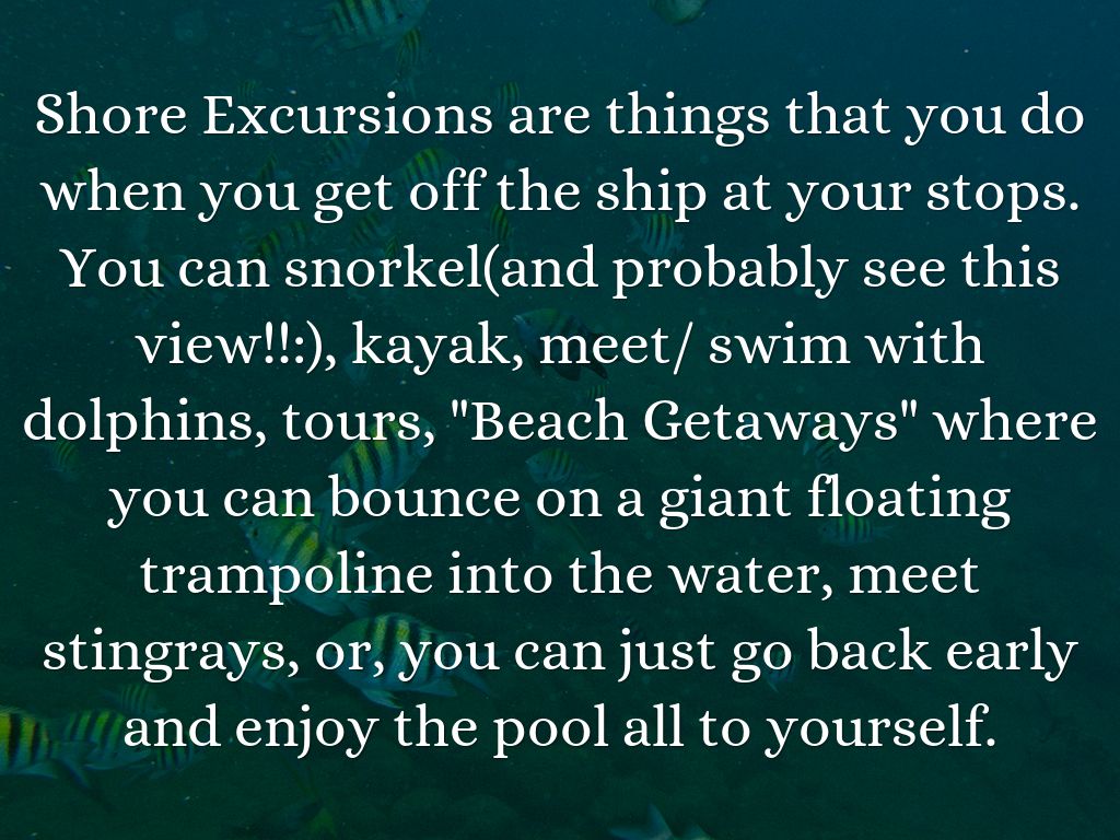 Shore Excursions are things that you do when you get off the ship at your stops. You can snorkel(and probably see this view!!:), kayak, meet/ swim with dolphins, tours, "Beach Getaways" where you can bounce on a giant floating trampoline into the water, meet stingrays, or, you can just go back early and enjoy the pool all to yourself.