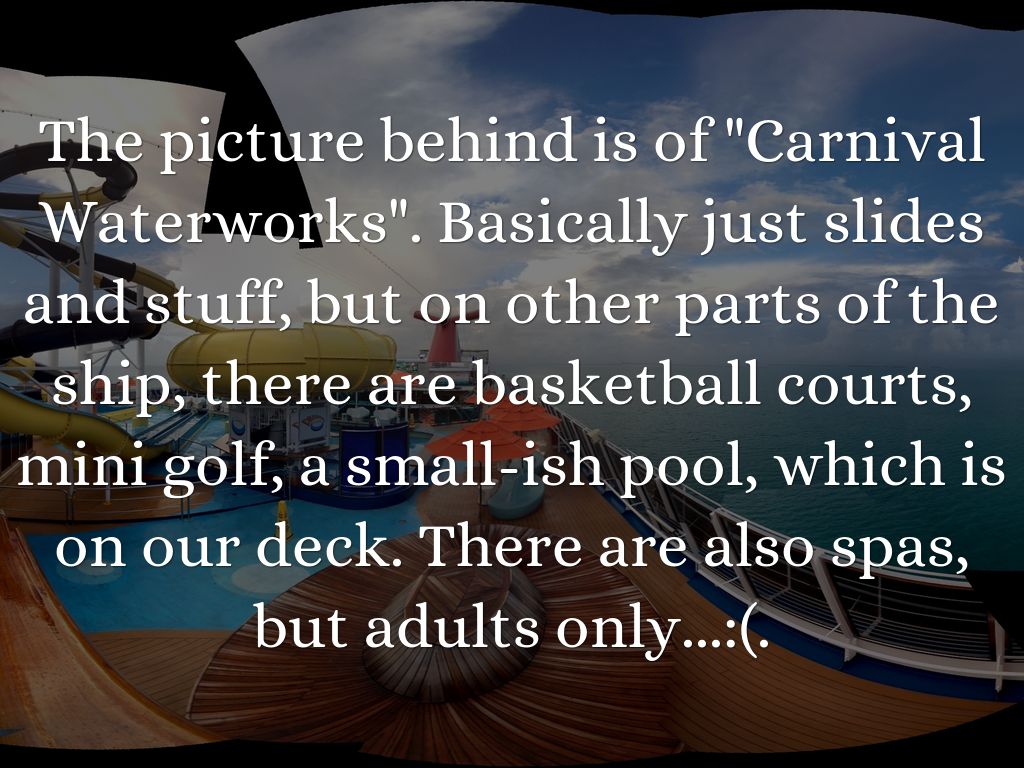 The picture behind is of "Carnival Waterworks". Basically just slides and stuff, but on other parts of the ship, there are basketball courts, mini golf, a small-ish pool, which is on our deck. There are also spas, but adults only...:(.