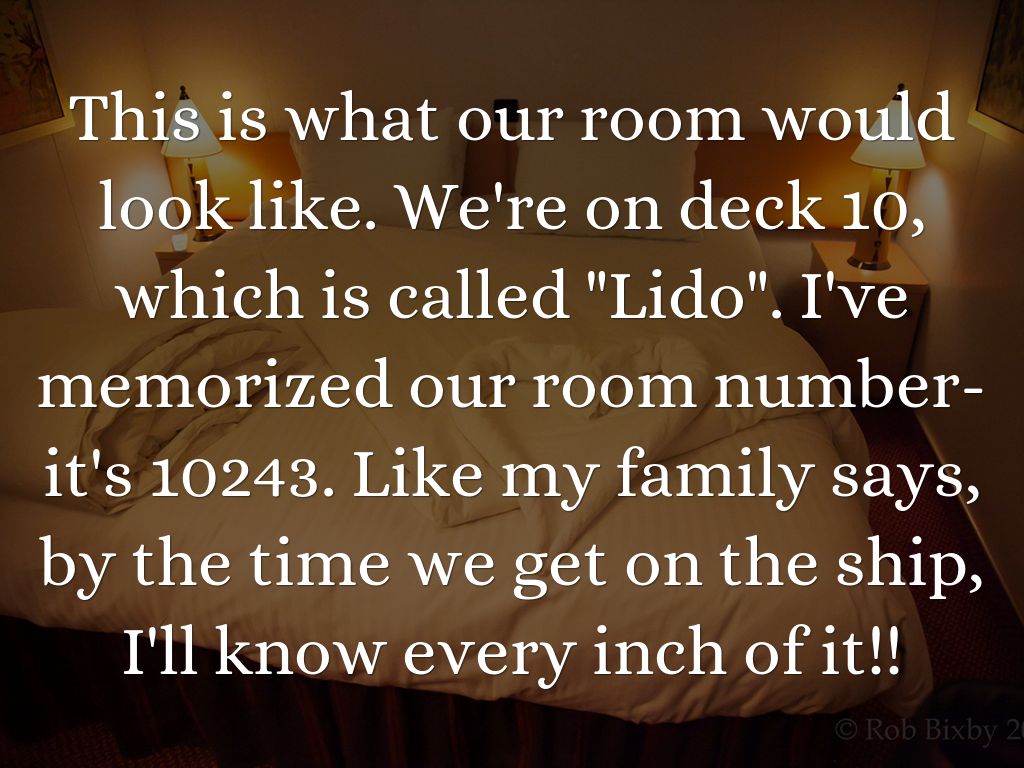 This is what our room would look like. We're on deck 10, which is called "Lido". I've memorized our room number- it's 10243. Like my family says, by the time we get on the ship, I'll know every inch of it!!