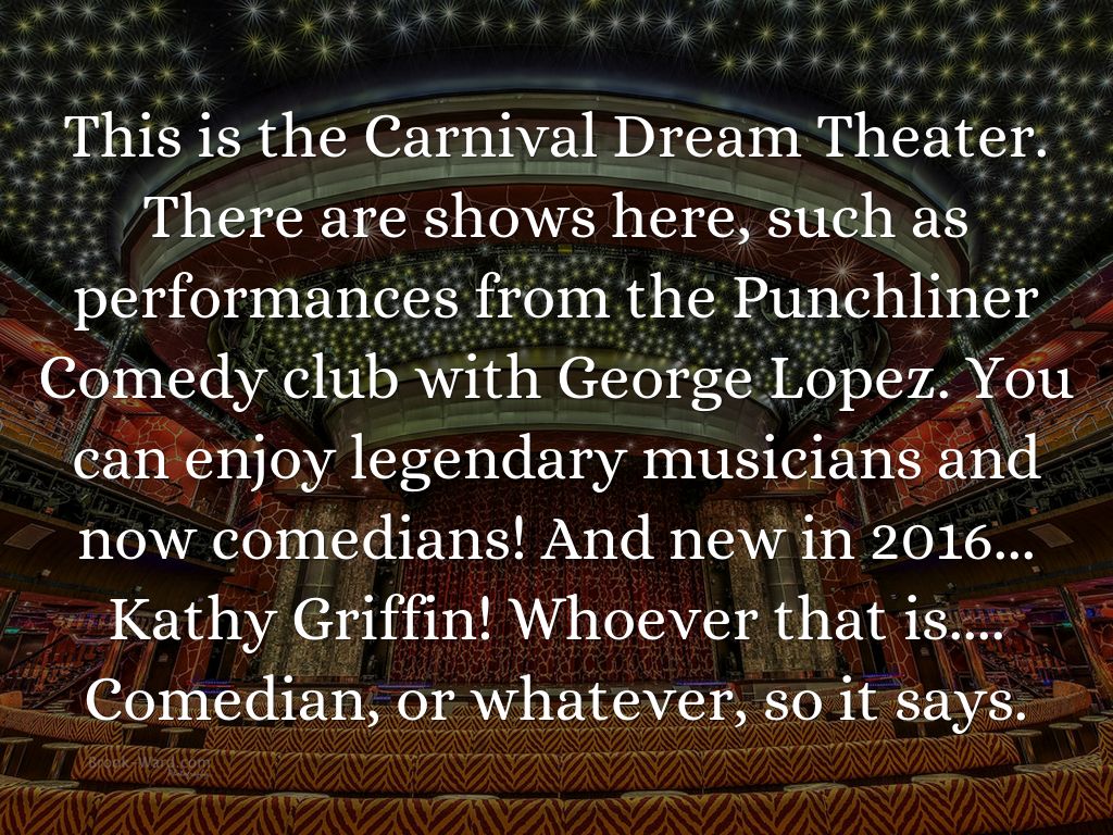 This is the Carnival Dream Theater. There are shows here, such as performances from the Punchliner Comedy club with George Lopez. You can enjoy legendary musicians and now comedians! And new in 2016... Kathy Griffin! Whoever that is.... Comedian, or whatever, so it says.