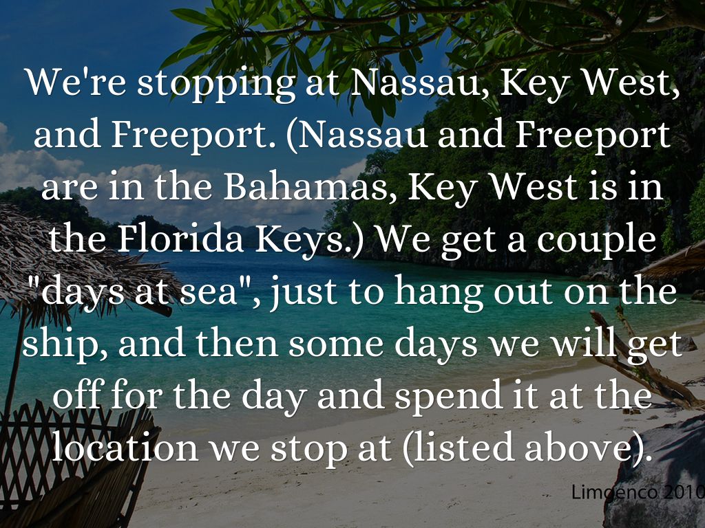 We're stopping at Nassau, Key West, and Freeport. (Nassau and Freeport are in the Bahamas, Key West is in the Florida Keys.) We get a couple "days at sea", just to hang out on the ship, and then some days we will get off for the day and spend it at the location we stop at (listed above).