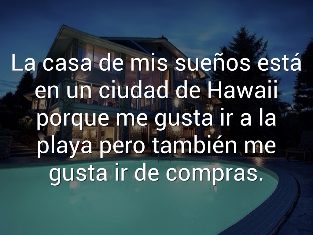 La casa de mis sueños está en un ciudad de Hawaii porque me gusta ir a la playa pero también me gusta ir de compras.