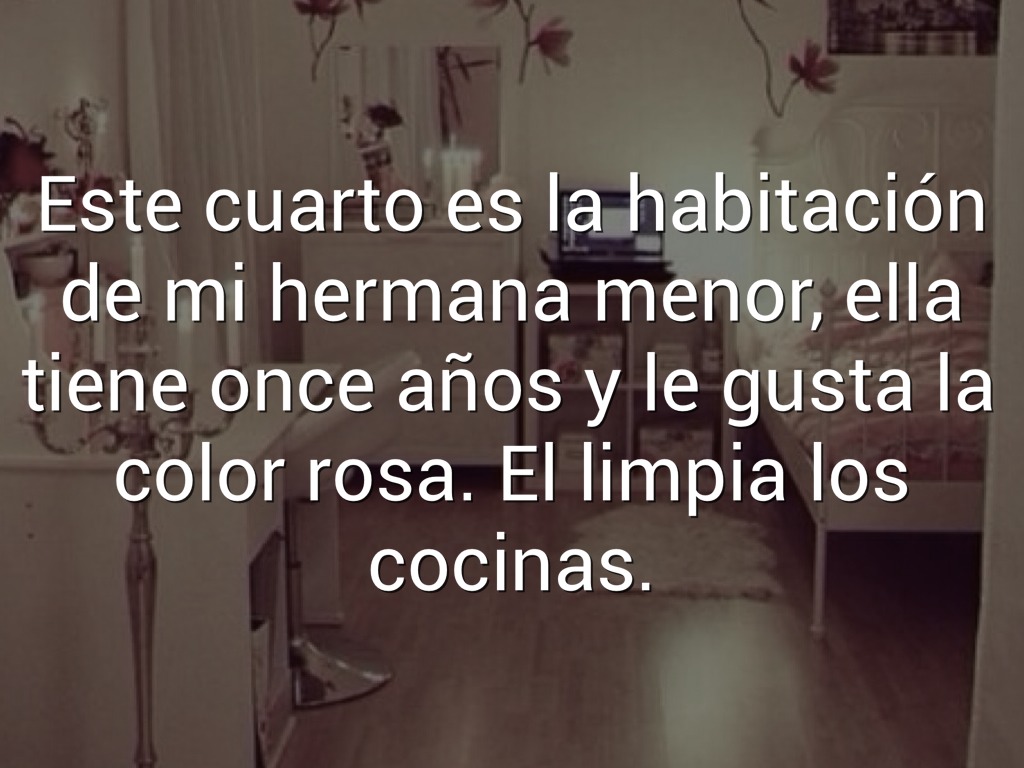 Este cuarto es la habitación de mi hermana menor, ella tiene once años y le gusta la color rosa. El limpia los cocinas.