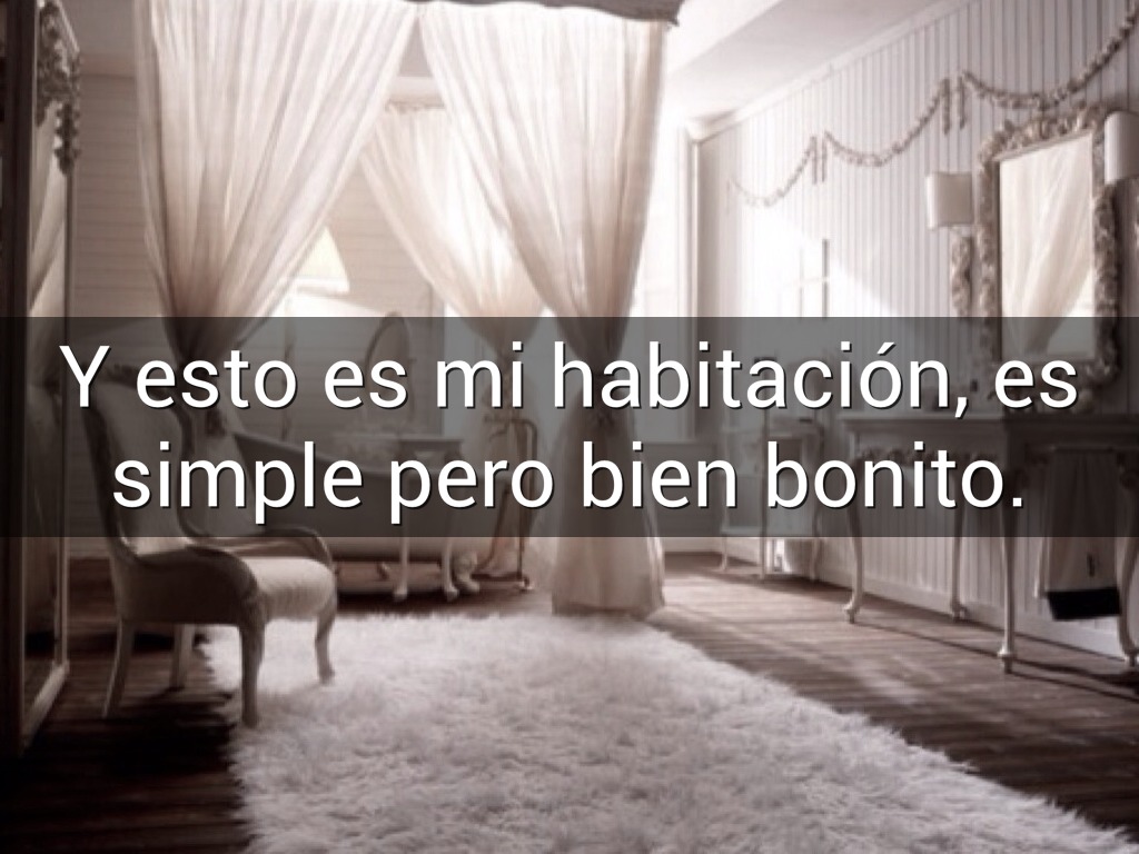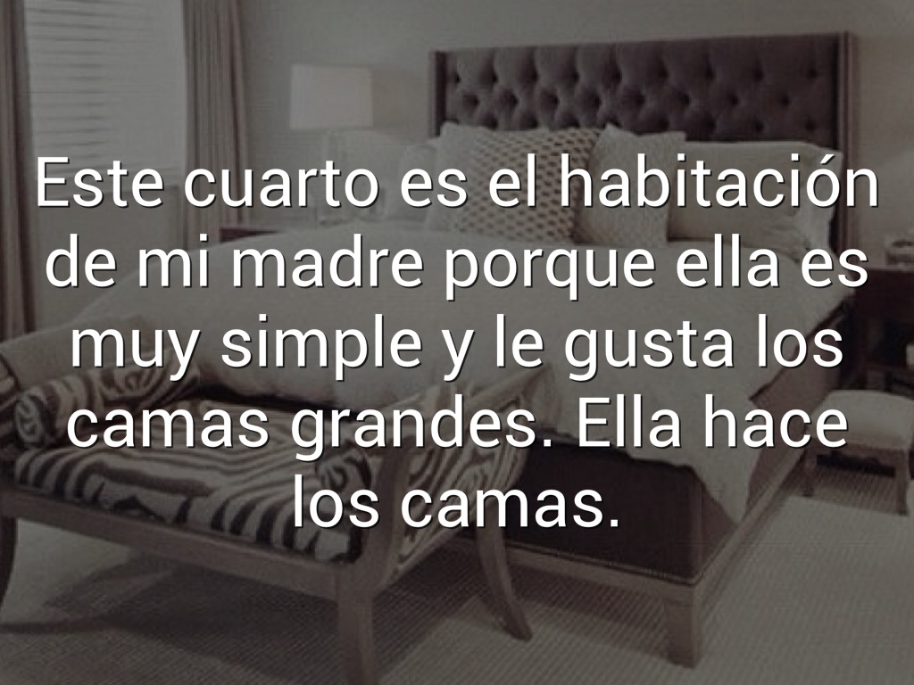 Este cuarto es el habitación de mi madre porque ella es muy simple y le gusta los camas grandes. Ella hace los camas.