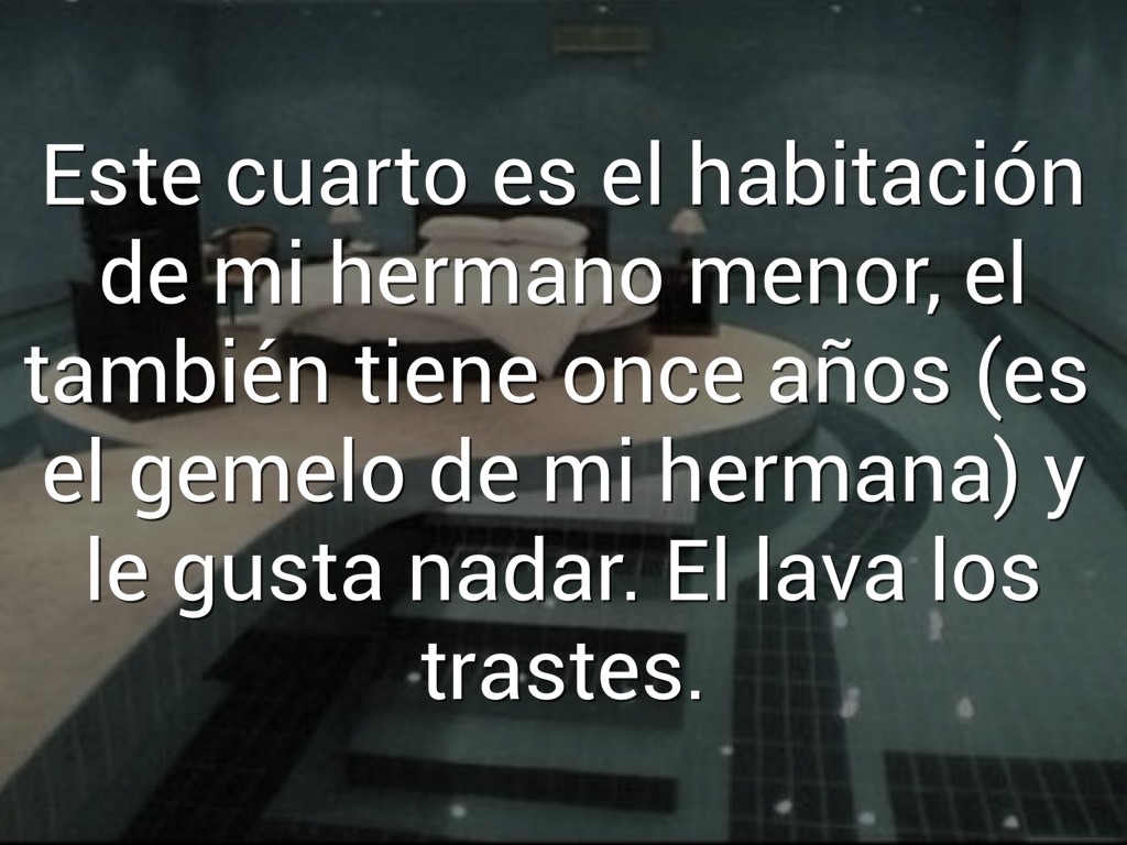 Este cuarto es el habitación de mi hermano menor, el también tiene once años (es el gemelo de mi hermana) y le gusta nadar. El lava los trastes.