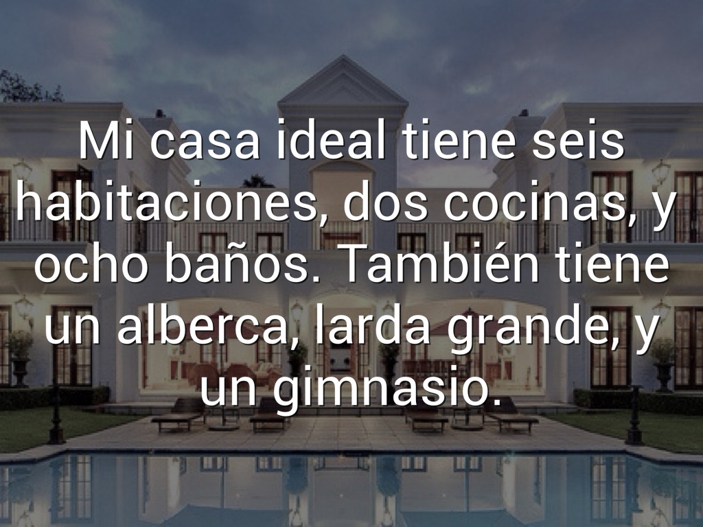 Mi casa ideal tiene seis habitaciones, dos cocinas, y ocho baños. También tiene un alberca, larda grande, y un gimnasio.