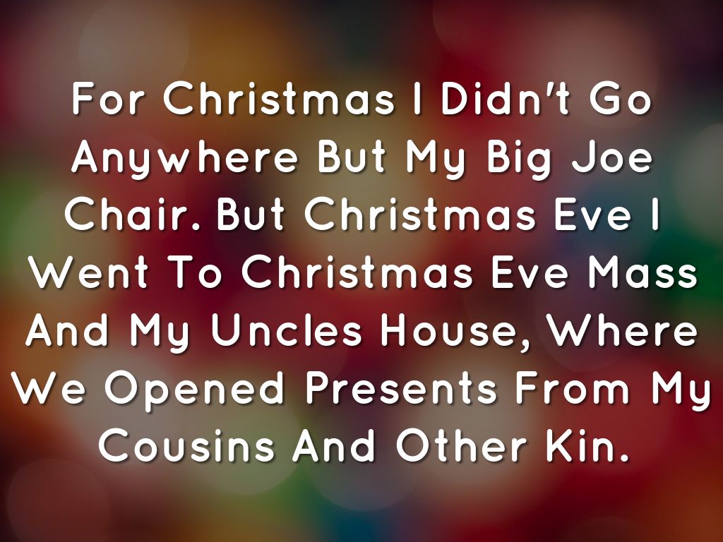 For Christmas I Didn't Go Anywhere But My Big Joe Chair. But Christmas Eve I Went To Christmas Eve Mass And My Uncles House, Where We Opened Presents From My Cousins And Other Kin.