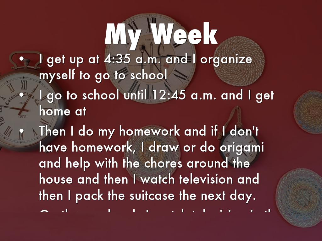 Then I do my homework and if I don't have homework, I draw or do origami and help with the chores around the house and then I watch television and then I pack the suitcase the next day.