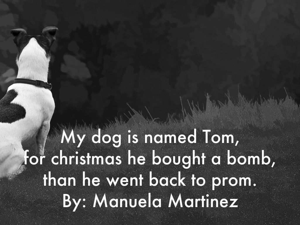 My dog is named Tom, for christmas he bought a bomb, than he went back to prom. By: Manuela Martinez