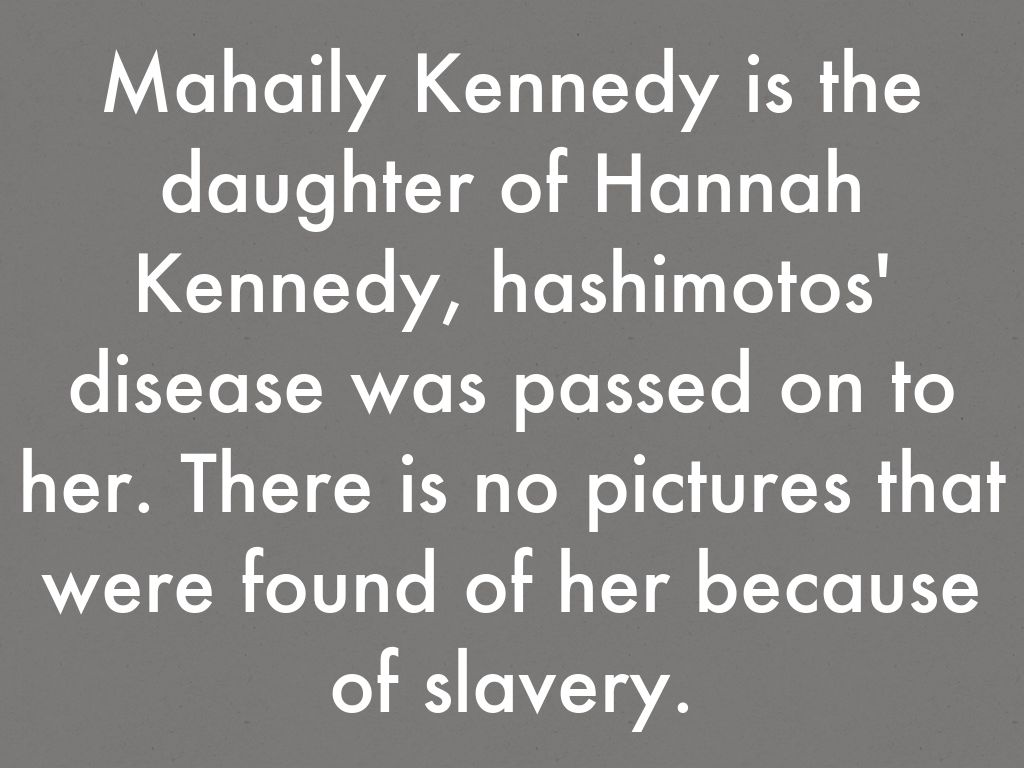 Mahaily Kennedy is the daughter of Hannah Kennedy, hashimotos' disease was passed on to her. There is no pictures that were found of her because of slavery.