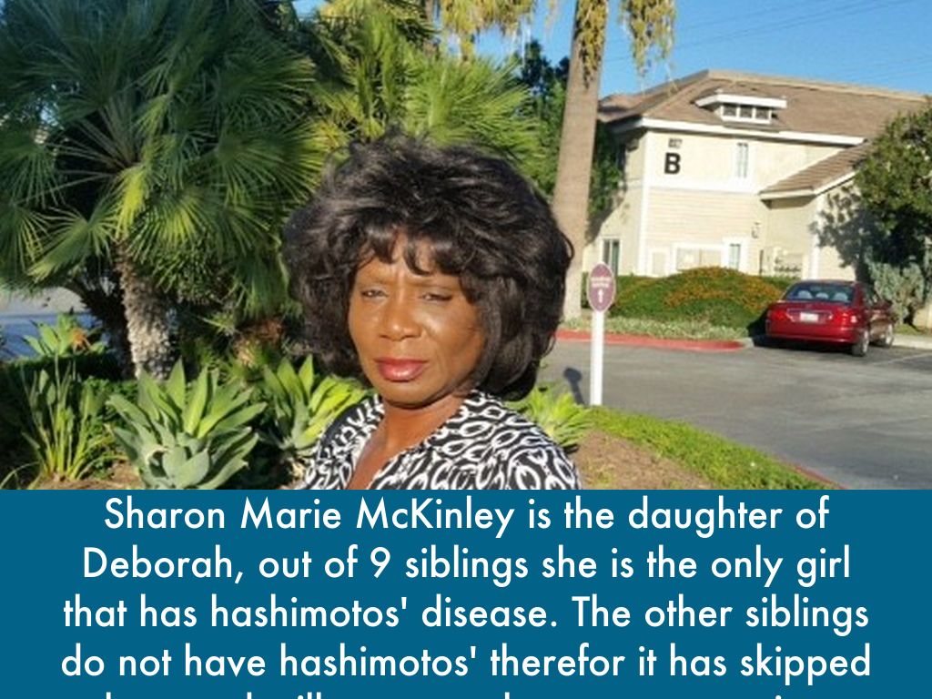 Sharon Marie McKinley is the daughter of Deborah, out of 9 siblings she is the only girl that has hashimotos' disease. The other siblings do not have hashimotos' therefor it has skipped them and will go on to the next generation.