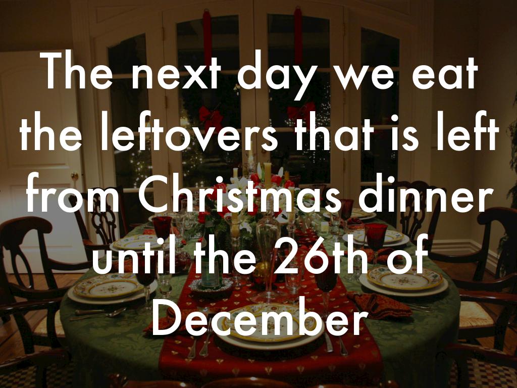 The next day we eat the leftovers that is left from Christmas dinner until the 26th of December