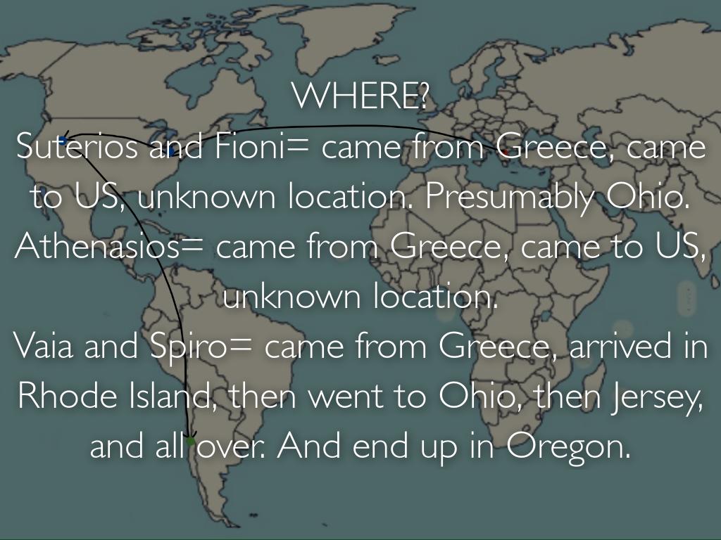 Vaia and Spiro= came from Greece, arrived in Rhode Island, then went to Ohio, then Jersey, and all over. And end up in Oregon.