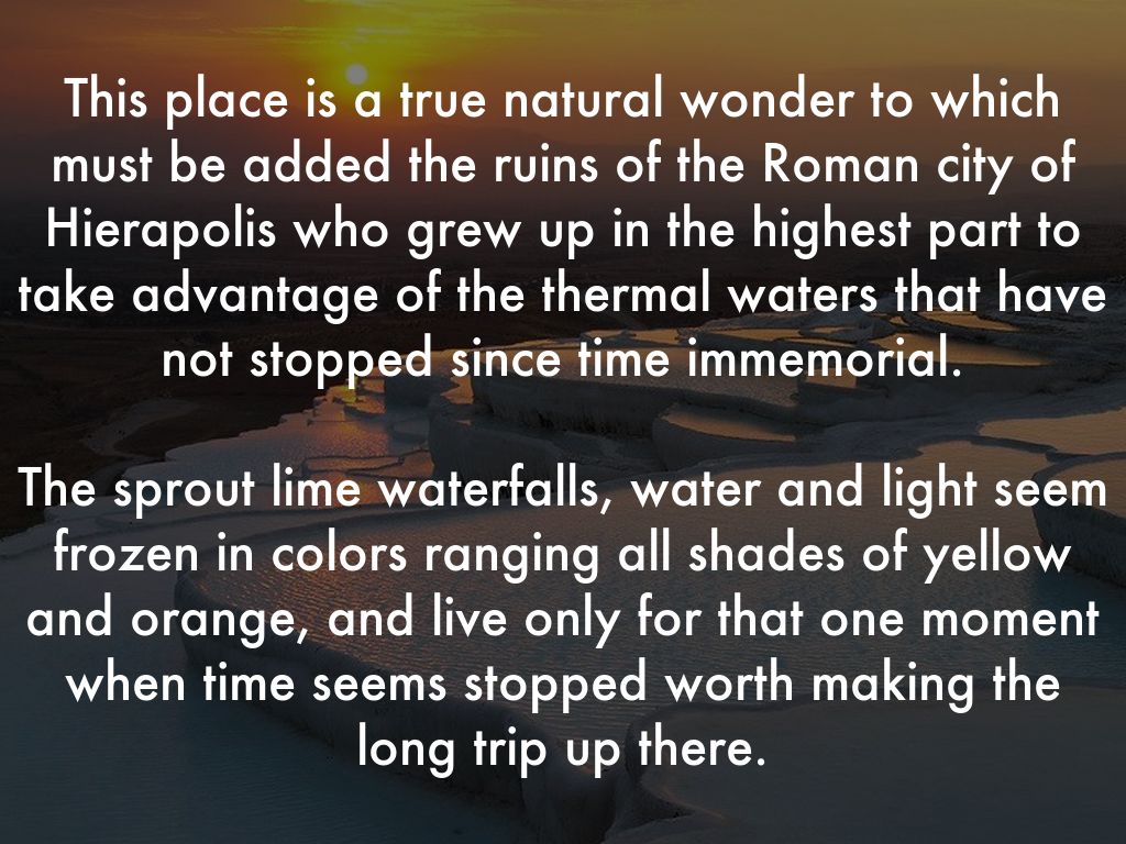 This place is a true natural wonder to which must be added the ruins of the Roman city of Hierapolis who grew up in the highest part to take advantage of the thermal waters that have not stopped since time immemorial.