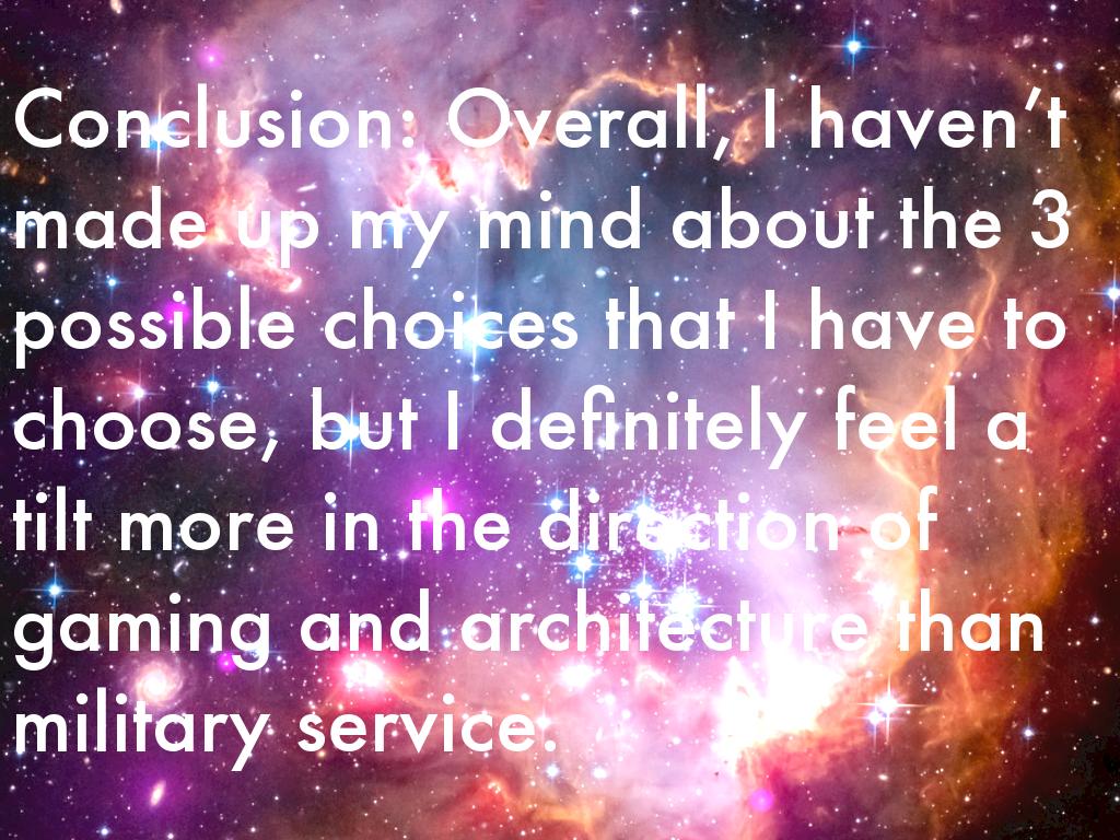 Conclusion: Overall, I haven’t made up my mind about the 3 possible choices that I have to choose, but I definitely feel a tilt more in the direction of gaming and architecture than military service.